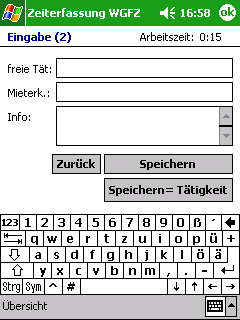 Die Hausmeister sowie weitere Mitarbeiter im mobilen Einsatz erfassen ihre Arbeitszeitdaten mit dem Pocket Loox. Die Tätigkeitsart kann mit Hilfe einer Tätigkeitsnummer oder über eine Volltextsuche in der Datenbank recherchiert werden. Gleiches trifft für die Zuordnung des Tätigkeitsortes (Verwaltungseinheit) zu. In Abhängigkeit von der gewählten Tätigkeit werden die Mitarbeiter zur Eingabe weiterer Daten aufgefordert (Mieterinfos, freie Tätigkeit). Zu jedem Datensatz kann ein freier Text ergänzt werden. Die Eingabe von Text kann per Buchstabenerkenner, Strichzugerkenner (PALM-kompatibel), Bildschirmtastatur und Handschrift (Transcriber) erfolgen. Die Erfassungssoftware ist für die Stifterfassung optimiert, so dass mit minimalen Stiftbewegungen gearbeitet werden kann. |